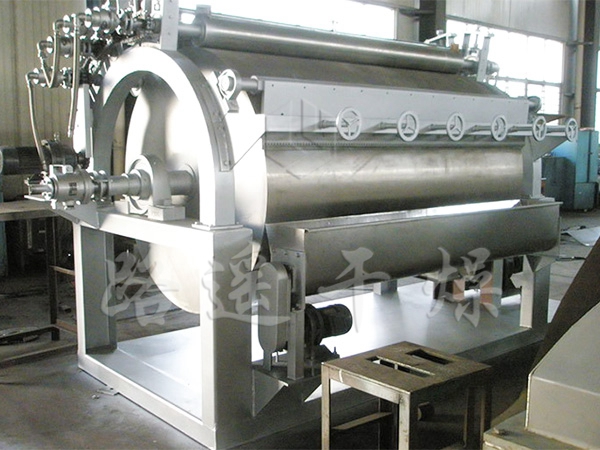 滾筒干燥機是一種內加熱傳導型轉動連續干燥設備。旋轉的滾筒通過其下部料槽,粘附著一厚度的料膜,熱量通過管道輸送至滾筒內壁,傳導到滾筒外壁,再傳導給料膜,使料膜中的濕得到蒸發、脫濕、使含濕分的物料得到干燥。干燥好的物料被裝置在滾筒表面的刮刀鏟離滾筒,到置于刮刀下方的螺旋輸送器,通過螺旋輸送器將干物料集中、包裝。
