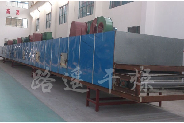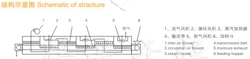 物料由加料器均勻地鋪在網(wǎng)帶上,網(wǎng)帶一般采用12-60目不銹鋼絲網(wǎng),由傳動裝置拖動在干燥機內(nèi)移動。干燥機由若干單元組成,每一單元熱風(fēng)獨立循環(huán),部分尾氣由專門排濕風(fēng)機排出,廢氣由調(diào)節(jié)閥控制,熱氣由下往上或由上往下穿過鋪滿物料的網(wǎng)帶完成熱量與質(zhì)量傳遞的進程,帶走物料水份。網(wǎng)帶緩慢移動,運行速度可根據(jù)物料溫度自由調(diào)節(jié),干燥后的成品連續(xù)落入收料器中。上下循環(huán)單元根據(jù)用戶需要可靈活配備,單元數(shù)量亦可根據(jù)需要選取。