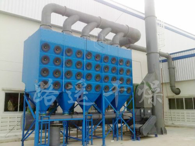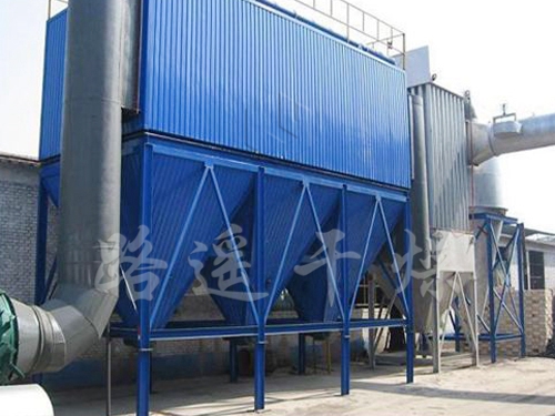 脈沖袋式除塵器主要由上箱體、中箱體、灰斗、進(jìn)風(fēng)均流管、支架濾袋及噴吹裝置、卸灰裝置等組成。含塵氣體從除塵器的進(jìn)風(fēng)均流管進(jìn)入各分室灰斗,并在灰斗導(dǎo)流裝置的導(dǎo)流下,大顆粒的粉塵被分離,直接落入灰斗,而較細(xì)粉塵均勻地進(jìn)入中部箱體而吸附在濾袋的外表面上,干凈氣體透過濾袋進(jìn)入上箱體,并經(jīng)各離線閥和排風(fēng)管排入大氣。隨著過濾工況的進(jìn)行,濾袋上的粉塵越積越多,當(dāng)設(shè)備阻力達(dá)到限定的阻力值(一般設(shè)定為1500Pa )時,由清···
